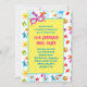 Birthday party invitations for a teen girl. Summer design, with layered look, and bright colors, this template invitation is easy to customize for any summer get-together. Three sections of text are in hand-printed fonts of aqua blue and hot pink colors. A pair of heart-shaped sunglasses at the top is part of the background pattern with flip flops, seashells, sunshine, palm trees and starfish in tropical colors. A sunglasses pattern covers the back of the cards, which come in size options and paper upgrades.