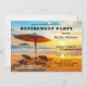 Um relaxante convite de festas de aposentadoria com cadeiras de salão na praia no pôr do sol. Na parte de trás está um design de onda abstrato. Excelente para qualquer pessoa que esteja ansiosa para o tempo livre após a aposentadoria.