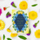 Coleção de casamentos de limão ensolarado com flores silvestres azuis e rosas com verde botânico