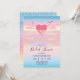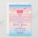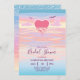 Um convite personalizado maravilhoso em cores pastel suaves. A paisagem romântica do nascer do sol com um sol rosa na forma de um coração. A zona costeira clássica para o casamento perfeito na praia ou para o casamento na ilha de destino.