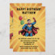 Celebrate your little hero in true comic-book style! This fun and colorful superhero birthday party design features a bold caped hero, festive balloons, and confetti on a bright sunburst background—perfect for an action-packed boys birthday celebration.