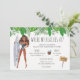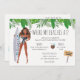 O convite para o fim de semana da festa de despedida de solteira tropical apresenta uma menina de tom de pele escuro com surf conselho. Detalhes do evento no verso do convite. Pode ser personalizado para qualquer evento.