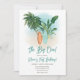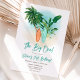 Conselho tropical de praia o grande convite de um aniversário com palmeiras exóticas, ilustração aquosa de ave do paraíso e praia tropical de destino com areia e oceano azul-turquesa, com dois conselhos surfs em madeira-de-boho-marrom e turquesa com um legal roteiro de pincel de fontes. Perfeito para primavera e convite de festas de crianças de verão