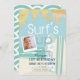 Este belo e moderno convite para fotos de primeiro aniversario do garoto do "Surf" apresenta um par de pranchas de surf em uma praia de areia branca tropical com palmeiras. O verso apresenta um fundo azul-turquesa claro com padrões de ondas brancas. Personalize para suas necessidades. Você pode encontrar mais produtos correspondentes na minha loja.