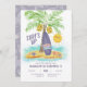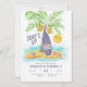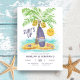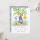 A praia e o convite de aniversário de surfe apresentam uma legenda de "surf" e uma ilha tropical com aquarela com surfboard, palmeira, sol kawaii e estrela do mar. A cor predominante é um roxo mudo, por isso é perfeita para um menino ou para uma menina. Arte por KL Stock