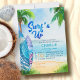 Convite de aniversário de surf que você pode personalizar para qualquer idade. Design apresenta cena de praia aquarela com oceano, palmeiras e pranchas de surfe e legal inscrições. Design neutro por gênero para o aniversário de um menino ou festa de aniversário de uma menina e perfeito para o tema de surfe de verão, tema oceânico, sob o mar, festa de praia ou festa de piscina.
