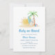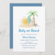 O convite para o chá de fraldas da praia do conselho, design com cor d'água, areia, pranchas, bola de praia e palmeira em tom branco e azul-oceano. Perfeito para chá de fraldas de verão, chá de fraldas hawiiano, bebezinho no conselho, tema do chá de fraldas surf. você pode personalizar texto e cor para seu único design e combinar com outros itens de nossa coleção, como suprimentos e decoração chá de fraldas.
