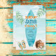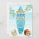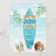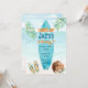 Navegar na praia oceano tropical de verão convite para modelo instantâneo. Fundo do oceano, conselho surf azul, palmeiras, chinelos e bebidas de coco.