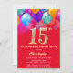 Surpresa 15 de Aniversário Vermelho e Dourado Balões Coloridos e Confetti Convite. Para mais personalização, clique no botão "Personalizar" e use nossa ferramenta de design para modificar este modelo.
