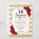 Surpresa 18º Convite de Aniversário. Branco feminino, design vermelho com ouro brilhante falso. Recursos stripes, rosa vermelha, fonte de script e confetti. Perfeito para uma bolsa mensageifesta de aniversario elegante. Pode ser personalizado para mostrar qualquer idade. Envie-me uma mensagem se precisar de mais personalização.