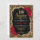 Surpresa 18º Convite de Aniversário. Preto feminino, design vermelho com ouro brilhante falso. Apresenta padrões de chita de leopardo animal, rosas vermelhas, fonte de script e confetti. Perfeito para uma bolsa mensageifesta de aniversario elegante. Pode ser personalizado para mostrar qualquer idade. Envie-me uma mensagem se precisar de mais personalização.