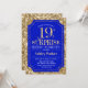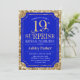 Surpresa 19º Convite à Celebração de Aniversário. Design elegante em azul real e padrão de ouro brilhante. Apresenta uma fonte elegante de script. Envie-me uma mensagem se precisar de mais personalização.