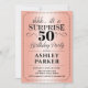 Surpreenda o 50º Convite de aniversário. Design simples em ouro rosa e preto. Apresentando um padrão de folha de rosa dourado falso e uma letra de script elegante. Celebração surpresa para homem ou mulher. Pode ser personalizado em qualquer idade!