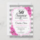 Surpreenda 50º Convite de Aniversário. Design cor-de-rosa feminina com prata brilhante. Apresenta faixas, rosas cor-de-rosa pinceladas, fontes de script e confetti. Perfeito para uma bolsa mensageifesta de aniversario elegante. Pode ser personalizado para mostrar qualquer idade. Envie-me uma mensagem se precisar de mais personalização.