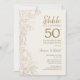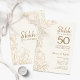 Convite de Celebração de Bodas de Ouro de 50 Anos Ivory Gold Botanical Surprise. Design moderno minimalista com destaques botânicos e tipografia em fonte de caligrafia. Cartão de convite floral simples perfeito para uma festa de aniversário surpresa elegante. Pode ser personalizado para qualquer ano de casamento. Convites Zazzle impressos ou modelo digital para impressão instantânea.