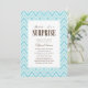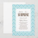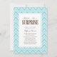 Convites surpreendentes para bebês com um padrão azul e azul oceano de stripe de chevron e texto marrom de chocolate. Personalize o texto com suas informações de festa surpresa. Visualize exatamente como o convite acabado será exibido na tela antes de solicitar.