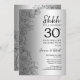 Convite de Celebração de Bodas de Prata e Preto Surpresa 30º Aniversário de Casamento. Design moderno minimalista com sotaques botânicos e fonte de tipografia script. Cartão de convite floral simples perfeito para uma festa de aniversário surpresa elegante. Pode ser personalizado para qualquer ano de casamento. Convites Zazzle impressos ou modelo digital para impressão instantânea.