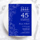 Convite de Celebração de Bodas de 20 Anos, Surpresa Floral Safira Branca. Design moderno minimalista em azul real com destaques botânicos e fonte de tipografia script. Cartão de convite floral simples perfeito para uma festa de aniversário surpresa elegante. Pode ser personalizado para qualquer ano de casamento. Convites Zazzle impressos ou modelo digital para impressão instantânea.
