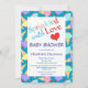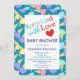Cones de sorvete com tema para o convite ao chá de fraldas. A frente apresenta um padrão de cones coloridos de sorvete, suas informações e a frase em várias cores "Sprinkled with Love". A parte de trás dos convites tem um padrão de cones de sorvete de cheio.