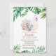 Este primeiro convite de aniversário com nadinho de água com flor, e folhas tropicais.