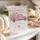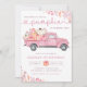 Sweet Little Pumpkin Pink Autumn Birthday Invitation featuring a pink pick-up truck, pumpkins, and autumn foliage