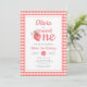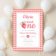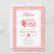Celebrate your little Sweet One's first birthday with our darling Strawberry Girl 1st Birthday Invitation! This sweet design showcases a cute strawberry wearing a coquette pink bow on a charming red and white gingham background. Perfect for your little girl's first birthday celebration. Order now and get ready to spread the sweetness with this charming and unique invitation! Matching party accessories available.