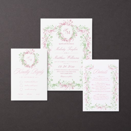 Convites Sweet Sage Green & Blush Floral Crest Wedding