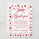 Sweetheart-themed thank you card for a first birthday celebration, featuring red hearts, a delicate bow frame, and elegant script typography. Perfect for Valentine-inspired or heart-themed birthday parties for a baby girl. This printable and customizable thank you card allows you to personalize the message and name, creating a charming keepsake to thank guests for celebrating and for their thoughtful gifts.