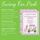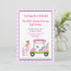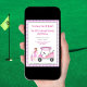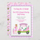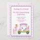 Swing Pink para Aumentar a Consciência do Cancer da Mama O design para o Convite à Saída do Golfe mostra uma mulher golfista com um saco de golfe rosa e um carrinho de golfe que tem um padrão de fita de câncer de mama nele. Um convite agradável para uma excursão de golfe de caridade que é facilmente personalizável com todas as informações sobre seu evento.