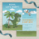 Um lado apresenta a ilustração fofa original de Destei de um dinossauro Tiranossauro Verde / Dinossauro T-rex com palmeira tropical e algumas plantas em um dia encoberto. A grama é verde e o céu é azul com três nuvens. Do outro lado há a ilustração original de um desenho animado de Destei de um dinossauro voador fofo chamado Pteranodon. Há várias áreas de texto de exemplo que podem ser editadas com os detalhes da festa de aniversário de uma criança, por exemplo.