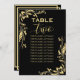 Estes elegantes cartões de assentos da mesa dourada número 2 são perfeitos para um casamento simples. Apresentam um design simples, mas elegante, com uma caligrafia dourada sobre fundo preto com um filigre floral de folha de papel dourado nos cantos.
