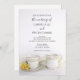 Convide convidados para a sua cerimônia de casamento com a elegante Taa Cup com Convite para Casamento de Dísias Amarelas. Este típico convite nupcial floreado personalizado apresenta uma fotografia floral de uma xícara de chá china, um pires e um creme com margaridas amarelas e uma cebola branca num pano de mesa úmido.