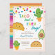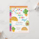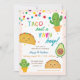 Ter um chá de fraldas temático de taco? Você vai adorar esses adoráveis convites para o chá de bebê. Apresentando tacos, cactos e personagens de abacate. A redação diz "Taco sobre um garoto BEBÊ!" A parte posterior inclui um padrão colorido de distribuição de serape.