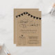 Convite apresenta ilustrações de um duo de tacos e um brinde com cerveja em um fundo kraft rústico maravilhoso.