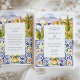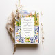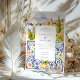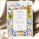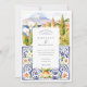 Convide seus convidados para uma comemoração romântica no coração da Sicília com este convite incrível de casamento artístico. A design capta lindamente o charme icônico de Taormina, apresentando uma ilustração de cor d'água espantosa da cidade costeira, do mar azul sereno e do majestoso Monte Etna ao fundo. A cena é flanqueada por lírios brancos elegantes e uma folhagem mediterrânica exuberante, evocando um senso de luxo de destino. A parte inferior do convite é adornada com uma fronteira intrincada e vibrante inspirada pelos tradicionais azulejos sicilianos Majolica. Ricas espirais azuis de cobalto estão entrelaçadas com flores coloridas e uma fruta central de citros, homenageando a rica herança artística da ilha. Seus detalhes de casamento são apresentados elegantemente no centro, criando um equilíbrio perfeito entre beleza cênica e design clássico. Este convite é ideal para um casamento de destino na Itália ou para qualquer casal que queira trazer um toque de sol e arte siciliana para o dia especial.