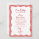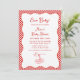 Comemore em estilo com este divertido convite de chá de fraldas inspirado em italiano. Apresentando uma ousada borda vermelha de gingham, quadro escalpado e uma ilustração de esparguete e almôndegas, este design define a cena de uma alegre reunião ao estilo de trattoria. A manchete do "Bebê do Ciao!" acrescenta um toque inteligente, perfeito para as famílias que amam a comida. Fácil de personalizar com seus detalhes de eventos, é uma escolha convidativa para chás de fraldas rústicos, confortáveis e encantadores.