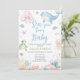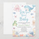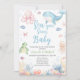 Convite de chá de bebê adorável debaixo do mar, apresentando animais marinhos em aquarela suave, incluindo baleia, polvo, tartaruga marinha, medusa, estrela-do-mar e detalhes de recife de coral. A expressão divertida "Vejo Você em Breve, Bebê" (em inglês, "Sea You Soon Baby", um trocadilho com "See You Soon Baby") adiciona um toque náutico doce, perfeito para celebrar o seu pequeno que está a caminho.