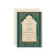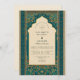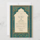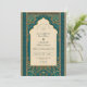 An opulent Islamic wedding design featuring a teal and gold arched frame inspired by mosque architecture and Persian artistry. With intricate floral motifs and geometric symmetry, this invitation exudes elegance, spirituality, and timeless cultural refinement — ideal for a luxurious Islamic wedding.