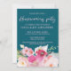 Design apresenta Watercolor Teal Blue Floral com fundo azul lacrimogêneo. Este modelo de convite de festas de aquecimento doméstico combina duas fontes diferentes para uma aparência mais dinâmica.