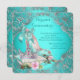 Azul teal Elegante O convite da Quinceanera com calçado azul-lacrimogêneo bonito e joia de diamante tiara num belo fundo azul-lacrimogêneo e espiral prateada. Esta princesa Quinceanera é facilmente personalizada para o seu evento simplesmente adicionando os seus detalhes no estilo de letra, cor e texto da sua escolha.