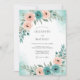 This watercolor design features a romantic palette of teal blue and blush pink. Soft peonies and delicate roses are intertwined with sage green eucalyptus foliage, creating a serene and airy atmosphere. Lush botanical arrangements adorn the corners against a subtle wash of pigment for a dreamlike quality.