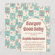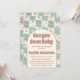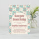 Celebrate your little one on the way with this charming pastel beach-themed baby shower invitation. Featuring a soft teal checkerboard background adorned with delicate seashells, bows, and ocean-inspired illustrations, this design creates a sweet and calming coastal vibe.