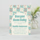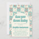 Celebrate your little one on the way with this charming pastel beach-themed baby shower invitation. Featuring a soft teal checkerboard background adorned with delicate seashells, bows, and ocean-inspired illustrations, this design creates a sweet and calming coastal vibe.