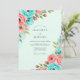 This design showcases a vibrant arrangement of teal and coral watercolor blossoms. Intricate ranunculus petals and soft pink buds are nestled among verdant leaves, creating a fresh and romantic aesthetic. The airy palette and hand-painted style evoke a cheerful atmosphere for a seasonal outdoor ceremony.