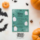 Celebre seu dia especial com este convite de aniversário de Halloween adorável! Apresentando um fundo teal divertido e fantasmas bonitos vestindo chapéus de festa, este convite é perfeito para uma comemoração manchada. A design divertida e festiva estabelece a palco de um cheio de aniversário de truques, guloseimas e alegria no Halloween! Personalize-o com todos os detalhes da festa e envie um convite que certamente encantará convidados e tornará o grande dia do seu filho inesquecível.