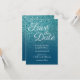 Foto brilhante e capa azul-oceano para o seu casamento, guarde as informações de data. O texto decorativo Salvar a Data é um estilo caligráfico contemporâneo adorável em branco. O casamento "faux glitter ombre" salve a data. O brilho da ombre é um efeito fotográfico impresso.