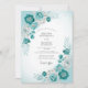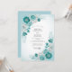 This serene design features a cool palette of teal and aqua watercolor blooms paired with silver-grey foliage. Elegant roses and delicate leaves create a frosty, romantic mood perfect for a cold-weather event. The airy composition focuses on lush floral clusters that evoke a sense of wintry sophistication.