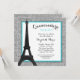 Uma Paris glamourosa temia Quinceanera convite. Mostre em azul verde, prata e preto. Apresentando uma ilustração da torre Eiffel com um fundo falso de brilho prateado. Os designs são gráficos impressos planos - NÃO É O GLITTER REAL. Gráficos por Ilustrações JW no MyGrafico