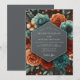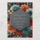 Embrace a mood of dramatic romance with this stunning floral composition. A rich palette of deep teal and warm paprika orange creates a bold contrast against a dark background. Lush, painterly roses and peonies bloom in a vibrant arrangement, evoking the opulent style of a classic still-life painting for your special day.