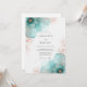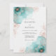 This design showcases fluid teal watercolor ink blooms paired with delicate rose gold metallic line-art illustrations. The artistic style creates an ethereal and sophisticated mood, perfect for a modern seasonal event. Elegant roses and botanical elements weave through the splashes of color, creating a luminous and airy aesthetic. The palette blends deep aqua tones with warm metallic accents.